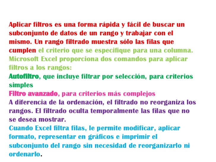 - 10. Aplicar filtros es una forma rápida y fácil de buscar unsubconjunto de datos de un rango y trabajar con elmismo. Un rango filtrado muestra sólo las filas quecumplen el criterio que se especifique para una columna.Microsoft Excel proporciona dos comandos para aplicarfiltros a los rangos:Autofiltro, que incluye filtrar por selección, para criteriossimplesFiltro avanzado, para criterios más complejosA diferencia de la ordenación, el filtrado no reorganiza losrangos. El filtrado oculta temporalmente las filas que nose desea mostrar.Cuando Excel filtra filas, le permite modificar, aplicarformato, representar en gráficos e imprimir elsubconjunto del rango sin necesidad de reorganizarlo niordenarlo.