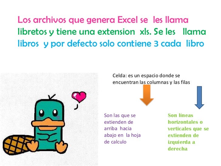 - 2. Los archivos que genera Excel se les llamalibretos y tiene una extension xls. Se les llamalibros y por defecto solo contiene 3 cada libro Celda: es un espacio donde se encuentran las columnas y las filas Son las que se Son líneas extienden de horizontales o arriba hacia verticales que se abajo en la hoja extienden de de calculo izquierda a derecha