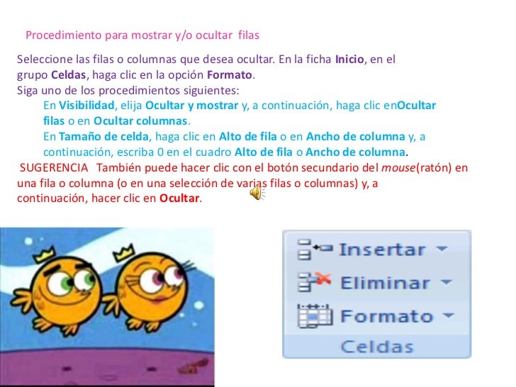 - 4. Procedimiento para mostrar y/o ocultar filasSeleccione las filas o columnas que desea ocultar. En la ficha Inicio, en elgrupo Celdas, haga clic en la opción Formato.Siga uno de los procedimientos siguientes: En Visibilidad, elija Ocultar y mostrar y, a continuación, haga clic enOcultar filas o en Ocultar columnas. En Tamaño de celda, haga clic en Alto de fila o en Ancho de columna y, a continuación, escriba 0 en el cuadro Alto de fila o Ancho de columna. SUGERENCIA También puede hacer clic con el botón secundario del mouse(ratón) enuna fila o columna (o en una selección de varias filas o columnas) y, acontinuación, hacer clic en Ocultar.
