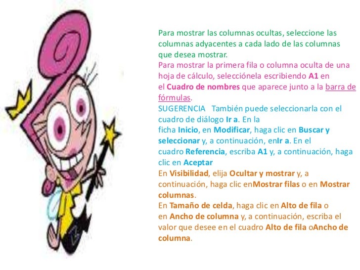 - 5. Para mostrar las columnas ocultas, seleccione lascolumnas adyacentes a cada lado de las columnasque desea mostrar.Para mostrar la primera fila o columna oculta de unahoja de cálculo, selecciónela escribiendo A1 enel Cuadro de nombres que aparece junto a la barra defórmulas.SUGERENCIA También puede seleccionarla con elcuadro de diálogo Ir a. En laficha Inicio, en Modificar, haga clic en Buscar yseleccionar y, a continuación, enIr a. En elcuadro Referencia, escriba A1 y, a continuación, hagaclic en AceptarEn Visibilidad, elija Ocultar y mostrar y, acontinuación, haga clic enMostrar filas o en Mostrarcolumnas.En Tamaño de celda, haga clic en Alto de fila oen Ancho de columna y, a continuación, escriba elvalor que desee en el cuadro Alto de fila oAncho decolumna.