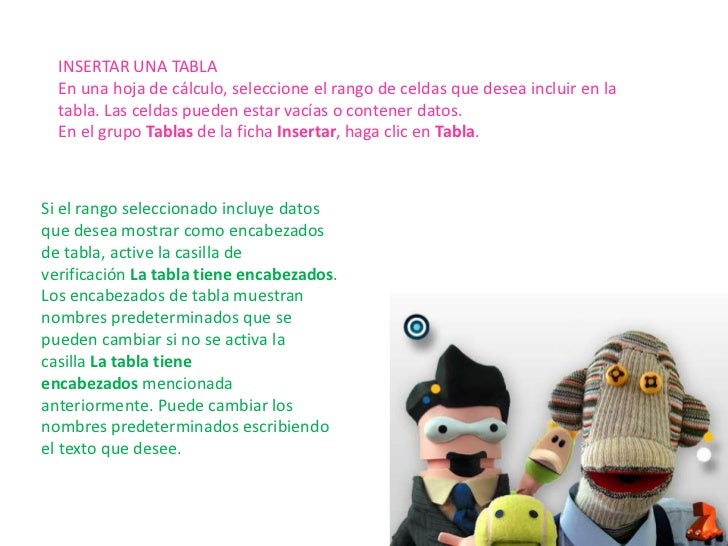 - 6. INSERTAR UNA TABLA En una hoja de cálculo, seleccione el rango de celdas que desea incluir en la tabla. Las celdas pueden estar vacías o contener datos. En el grupo Tablas de la ficha Insertar, haga clic en Tabla.Si el rango seleccionado incluye datosque desea mostrar como encabezadosde tabla, active la casilla deverificación La tabla tiene encabezados.Los encabezados de tabla muestrannombres predeterminados que sepueden cambiar si no se activa lacasilla La tabla tieneencabezados mencionadaanteriormente. Puede cambiar losnombres predeterminados escribiendoel texto que desee.