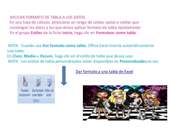 - 7. APLICAR FORMATO DE TABLA A LOS DATOS En una hoja de cálculo, seleccione un rango de celdas vacías o celdas que contengan los datos a los que desea aplicar formato de tabla rápidamente. En el grupo Estilos de la ficha Inicio, haga clic en Formatear como tabla.NOTA Cuando usa Dar formato como tabla, Office Excel inserta automáticamenteuna tabla.En Claro, Medio u Oscuro, haga clic en el estilo de tabla que desea usar.NOTA Los estilos de tabla personalizados están disponibles en Personalizadouna vezque se ha creado uno o más de ellos. Para obtener información acerca de la creaciónde estilos de tabla personalizados, vea Dar formato a una tabla de Excel.